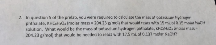 . Calculate the mass of KHC8H4O4molar mass 20423gmol that reac with 15 mL of the 015 M NaOH. Web Up to 256 cash back Potassium hydrogen phthalate KHC 8 H 4 O 4 molar mass 2042 gmol is a primary standard acid that reacts with sodium hydroxide in a 11. Web calculate the mass of KHC8H4O4 molar mass 20423gmol that reac with 15 mL of the 015 M NaOH.