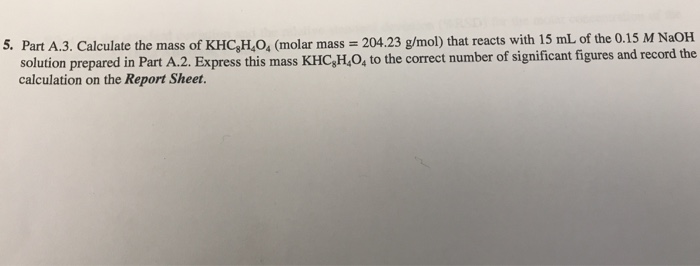 Calculate the mass of KHC8H4O4molar mass 20423gmol that reac with 15 mL of the 015 M NaOH. Express this mass KHC8H8O4 to the correct Do mathematic. Web Calculate the mass of KHC_8H_4O_4 molar mass 20423 gmol that reacts with 15 mL of 01 M NaOH solution.